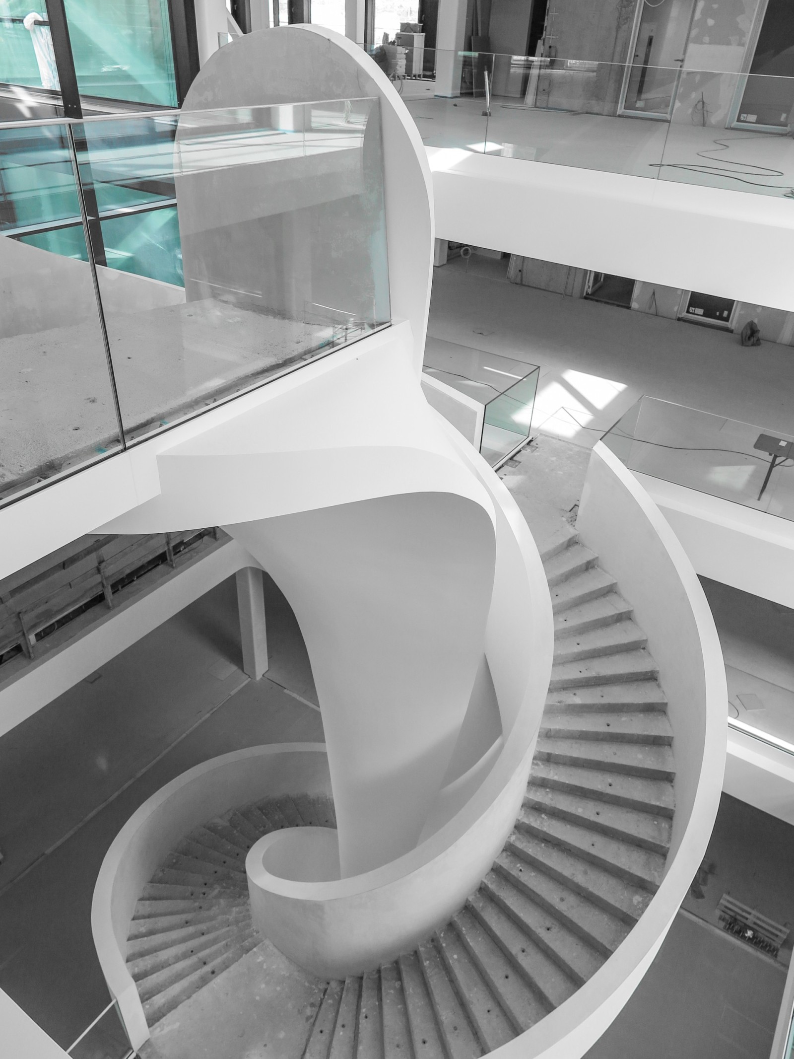 Teil der anspruchsvollen Architektur und eines der schwierigsten Bauteile war der einzigartige geschwungene Treppenaufgang im Foyer, der sich um eine innenliegende Tulpenskulptur in die Höhe dreht.