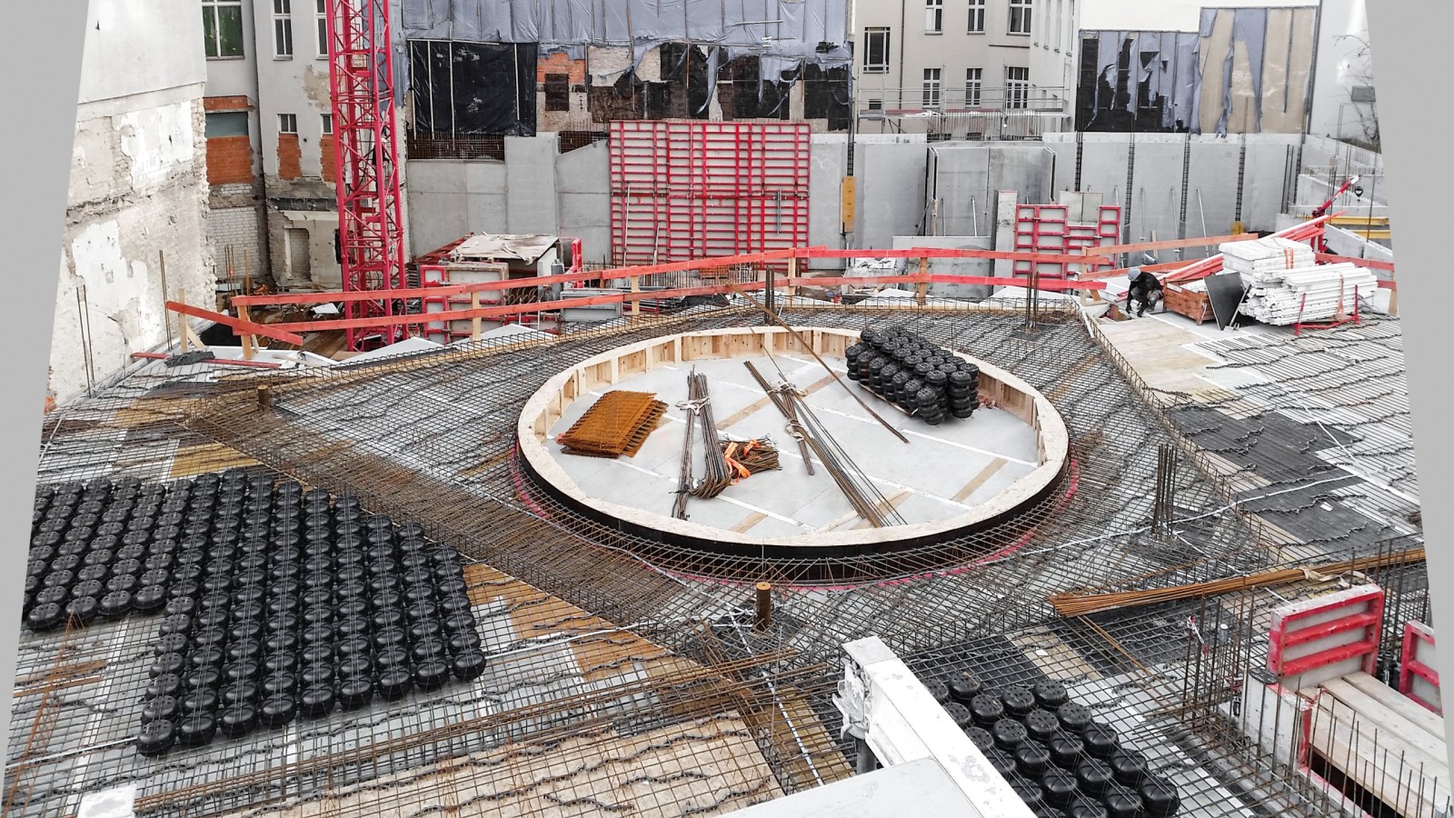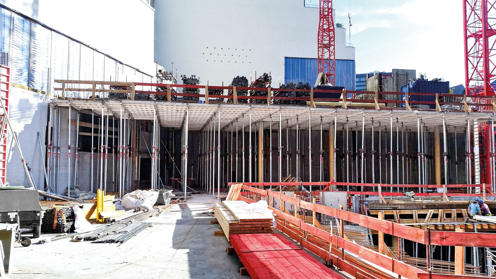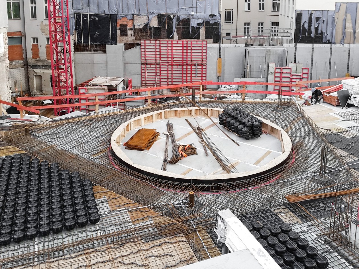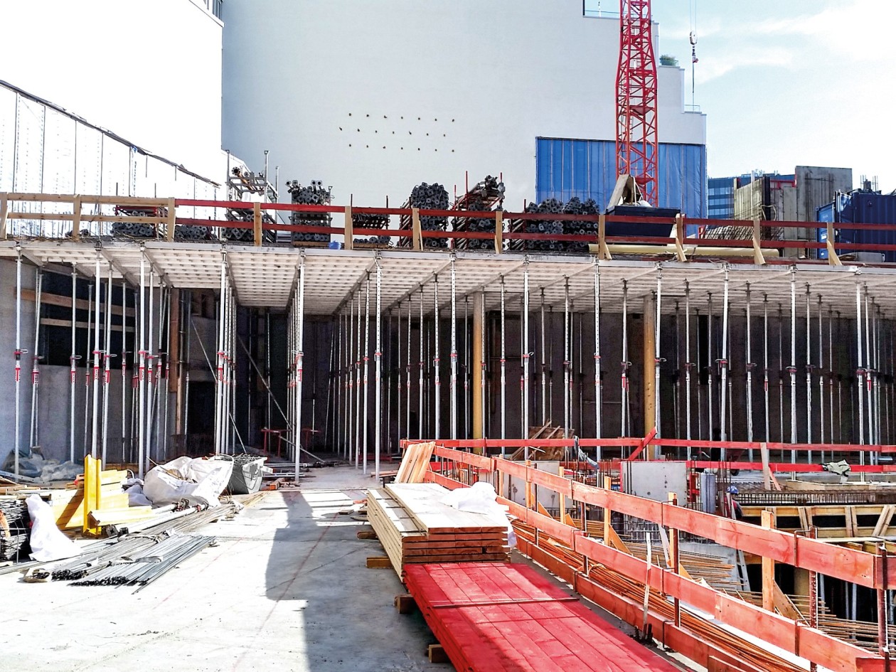 Da die Grundwasserverhältnisse eine Bauweise mit umfassenden Trogwänden erforderten, musste die Schalung der Außenwände in den zwei Untergeschossen einhäuptig gegen den Baugrubenverbau ausgeführt werden. Die robusten Stützböcke STB 450 erleichterten dank ihrer kompakten Bauweise ohne Überbreite den Transport, die platzsparende Lagerung und den Einsatz. Sie leiteten problemlos die hohen Lasten der Wandschalung ins Fundament ab. Hinsichtlich der von den Stützböcken in die Hohlkörperdecke eingeleiteten hohen Einzellasten gab es intensiven Abstimmungsbedarf mit der technischen Abteilung von MEVA. Zusätzliche Maßnahmen wurden von MEVA geplant und von der bauausführenden Firma erfolgreich realisiert. Die Industrieschalung Mammut 350 mit vollflächiger Frischbetondruckaufnahme bis 100 kN/m² hatte keine Probleme mit den großzügigen Wandhöhen bis 5,20 m. Bis zum 2. Obergeschoss waren dann lichte Höhen von ca. 4,50 m gefordert.