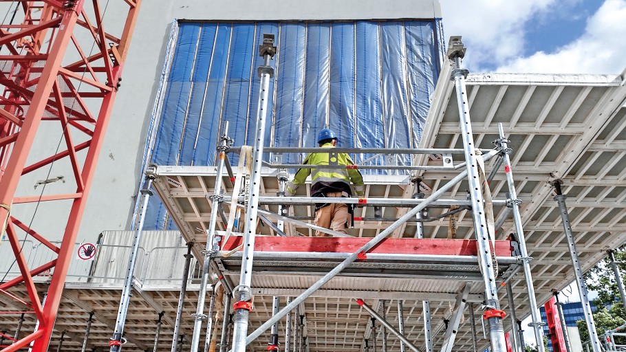 Die Mark-A. Krüger Bauunternehmung setzte auch den MEVA-Treppenturm MTT mit rutschsicheren Böden für sicheren Aufstieg ein. Außerdem mehr als 3.200 EuMax Baustützen für Deckenschalungen bis 5,50 m Höhe sowie Betonierklappbühnen BKB für komfortables Arbeiten auf 1,25 m breiter Lauffläche.
