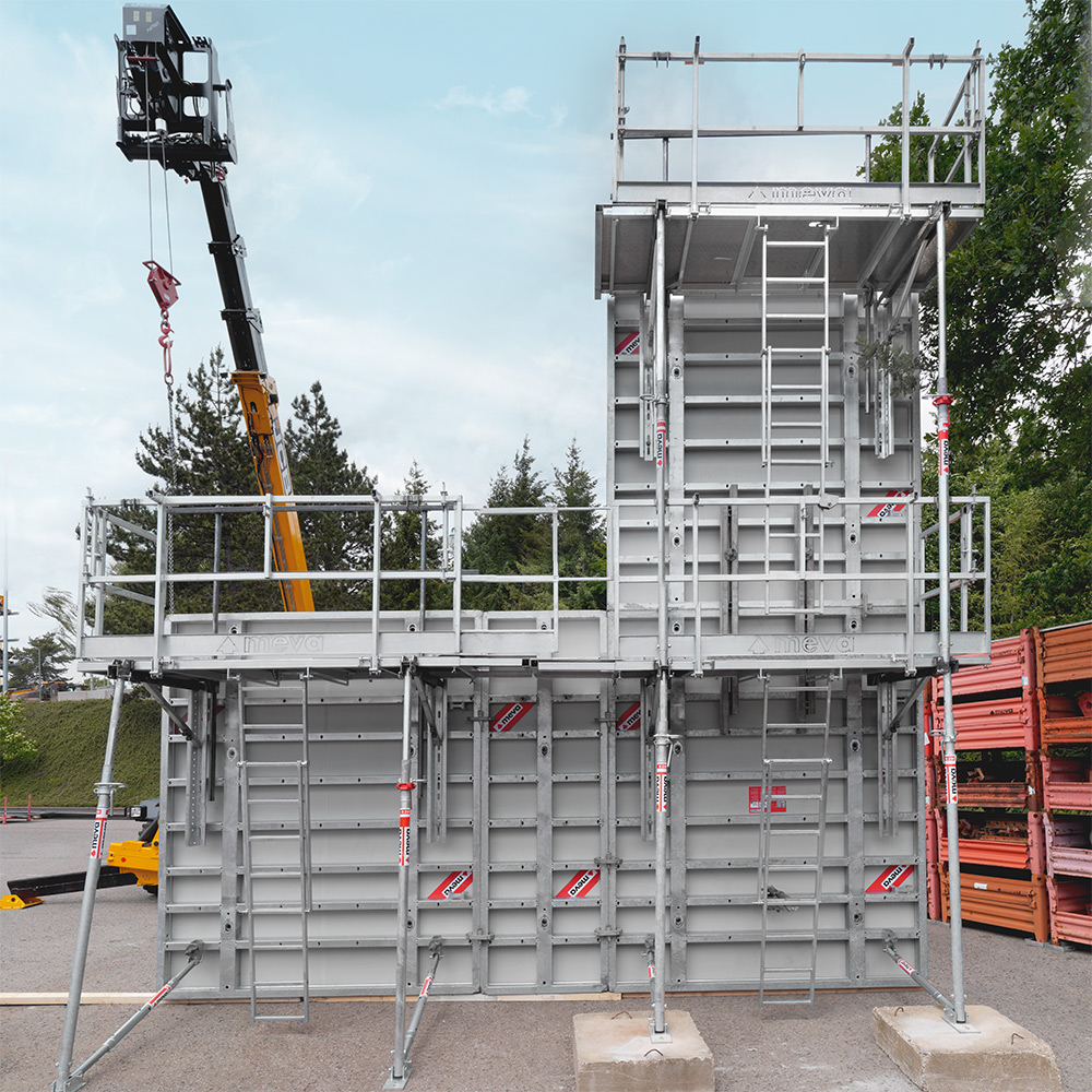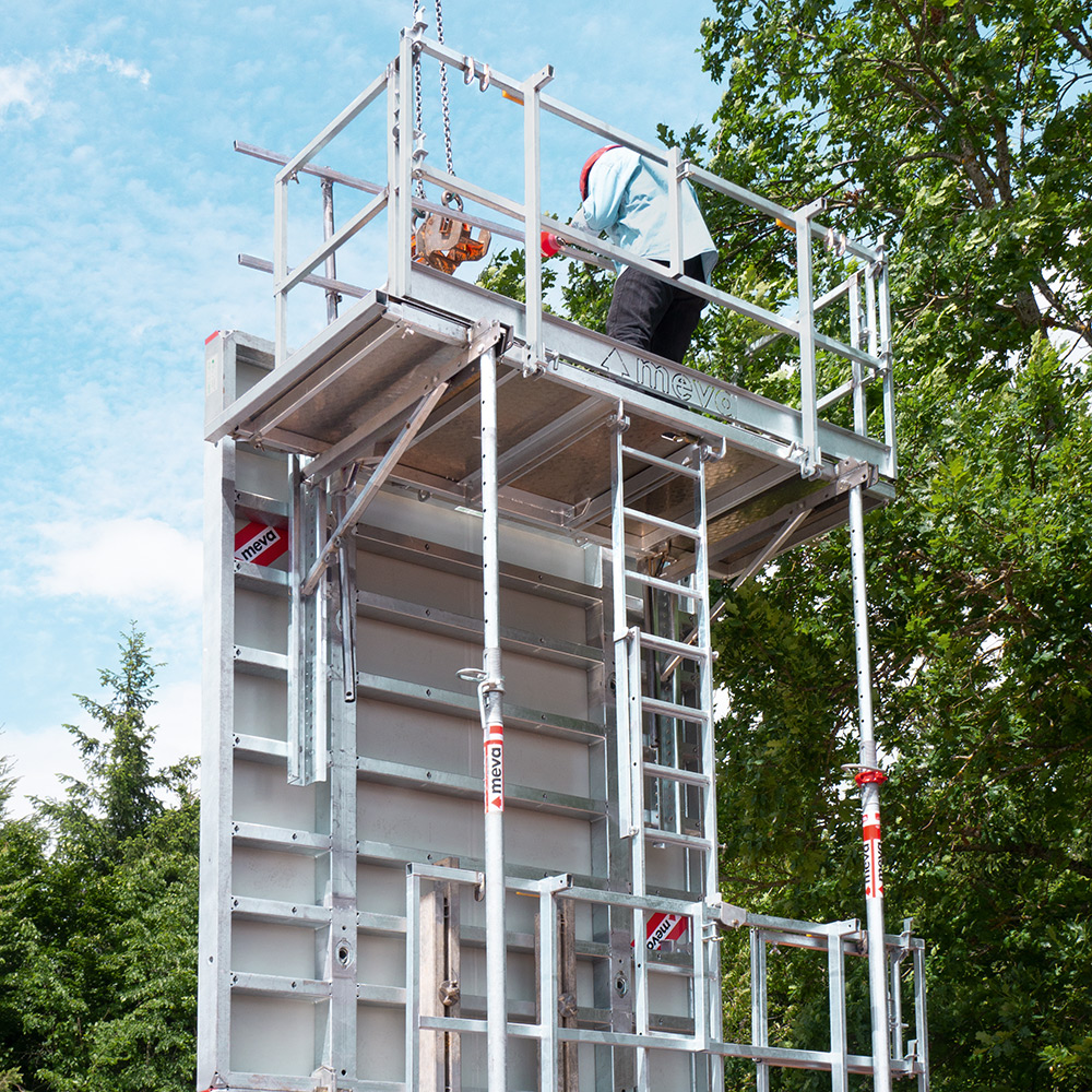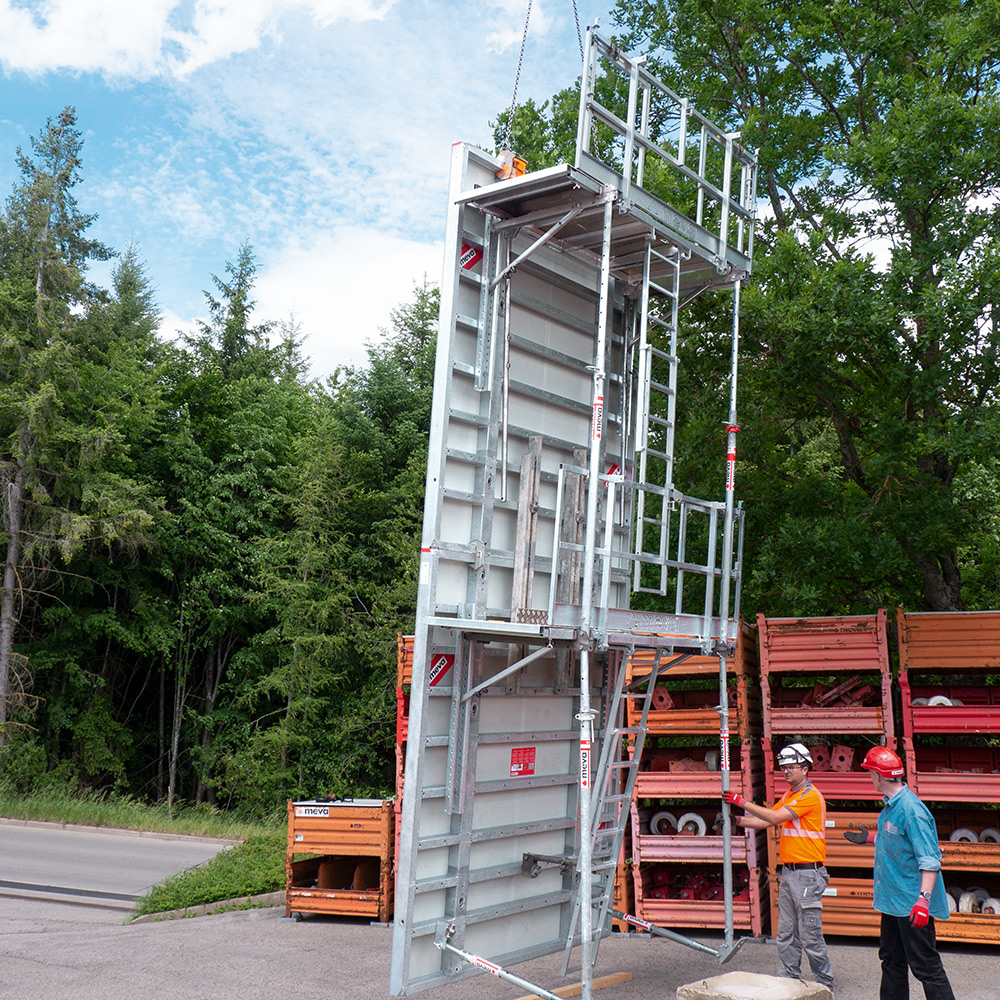 Sicheres, komfortables Arbeiten, mehrstöckig in großen Höhen und mit geringem Montageaufwand – das ist MIS. Die Zugangslösung für Betonierarbeiten mit der flexiblen, leistungsstarken Wandschalung Mammut XT wird sicher am Boden liegend montiert, als komplette Einheit per Kran aufgerichtet und versetzt. Hubarme ermöglichen sicheres Aufstellen ohne Schrägzug.