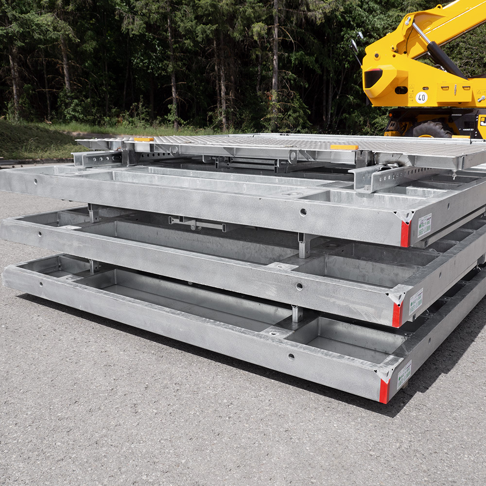 Geringer Montageaufwand für schnellen Baufortschritt. Komplette Einheiten werden einfach per Kran umgesetzt. Zusammengeklappt mit minimalem Platzbedarf (Höhe