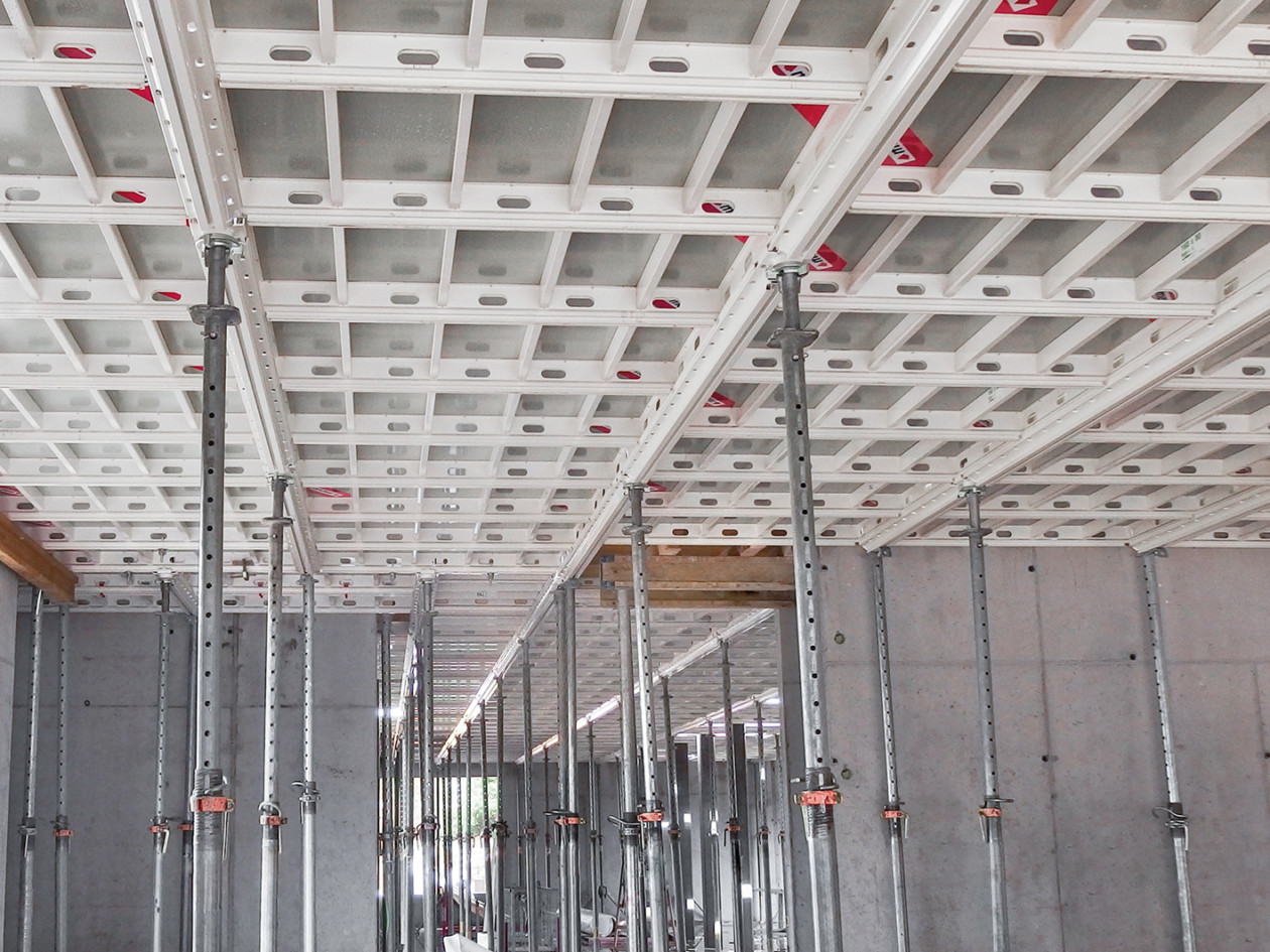Our latest MevaDec slab formwork system is lightweight and easy to use. It is not bound to a rigid grid pattern, meaning that it can be adapted to suit any building layout and any slab thickness.
