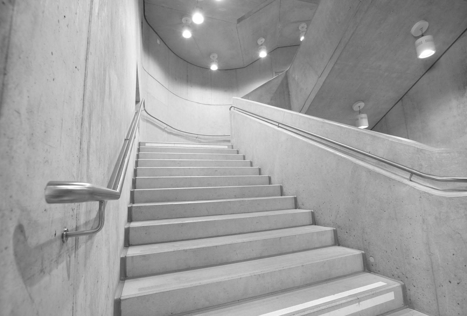 The inclined core walls are poured with an architectural concrete surface and a board pattern is applied to them. The pattern is achieved with wooden boards attached to the Mammut 350 panels.