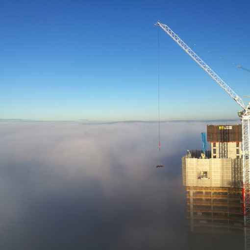 The low panel weight also helped, as the panels could be transferred to the next floor level with a lifting gear, rather than by being craned in. This saved time, as well as making sure any cranes could be used for other activities.