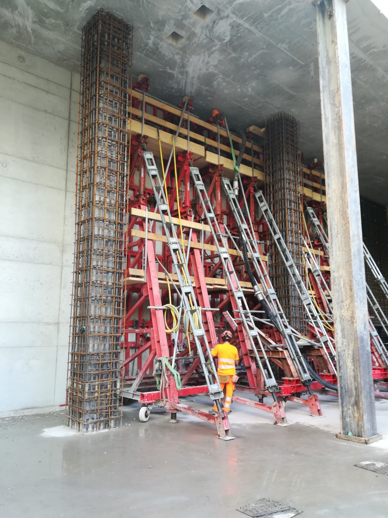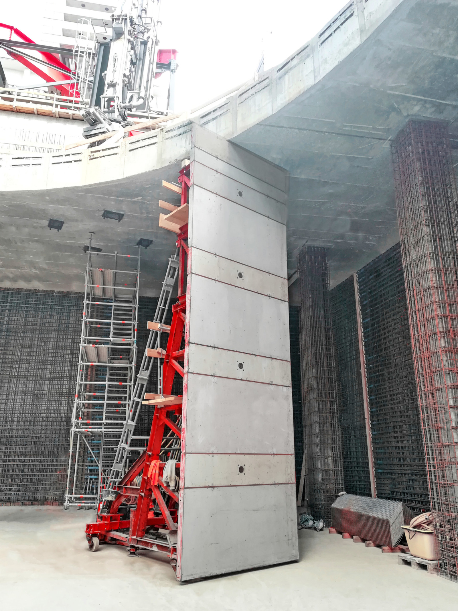 The initial excavations for the three basement levels included a 20-metre-deep excavation, which required bracing. In addition, the crane would not be available to move formwork for the basement walls, so the process needed to be determined in advance.After the bracing slab with a ring-shaped opening was poured, the construction of the walls below was planned using the STB 450 support frame. As it was not possible to move the formwork using a crane, mobile support frames were used in the confined conditions of the basement excavation.