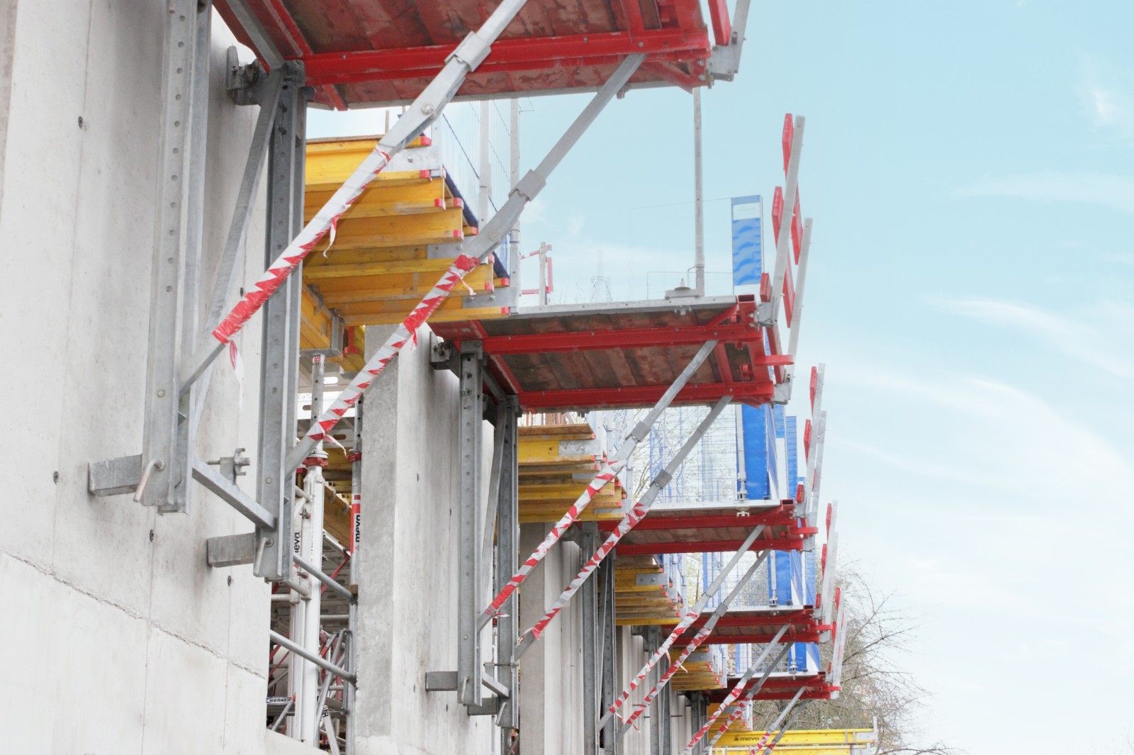 Shear walls were cast at the front of the parking levels for structural purposes. Glass panels will later be installed between the walls as a feature. Originally, conventional scaffolding was to be used for access for the external formwork. However, the folding working platform KAB from MEVA was deemed to provide significant advantages, as it is more effective than traditional scaffolding in terms of material and labour costs. The brackets can support formwork and access loads and have proven themselves in the tight access area between the buildings front elevation and the site perimeter. KAB is also being used for similar works throughout the project.