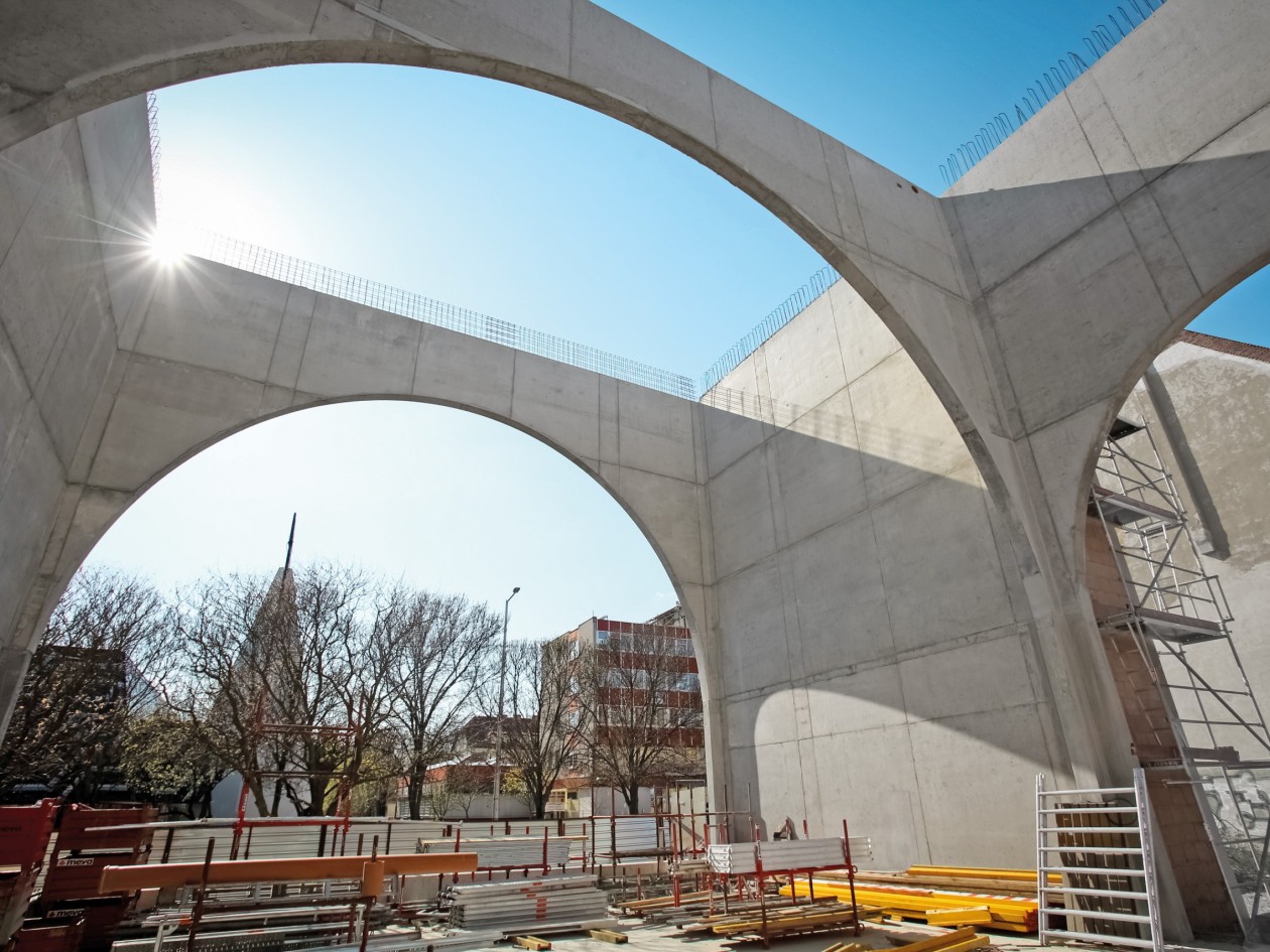 Linear and airy, modern and classic at the same time: during the construction of a new market hall in Pécs, Hungary, MEP shoring tower vouched for safety and stability and Mammut 350 impressed with its symmetrical tie and joint pattern.