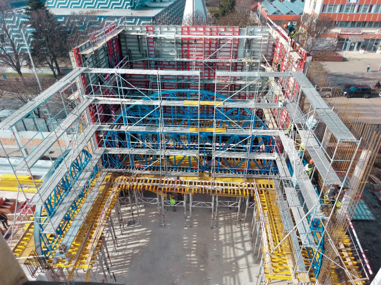 Linear and airy, modern and classic at the same time: during the construction of a new market hall in Pécs, Hungary, MEP shoring tower vouched for safety and stability and Mammut 350 impressed with its symmetrical tie and joint pattern.