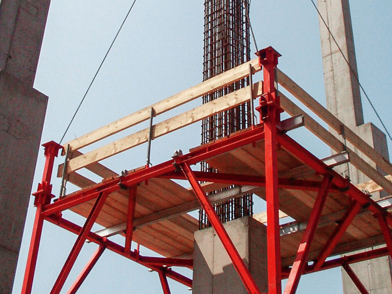 Space provides all the formwork bracing you need with just a few standard parts, while serving as a working platform for rebar or concreting works, even at heights above 35m. The individual tower units have a footprint of 4.80m² and are pre-assembled and bolted together at ground level. The tower is then built from 300cm-high units, which can be extended by 50cm or 100cm extension units.