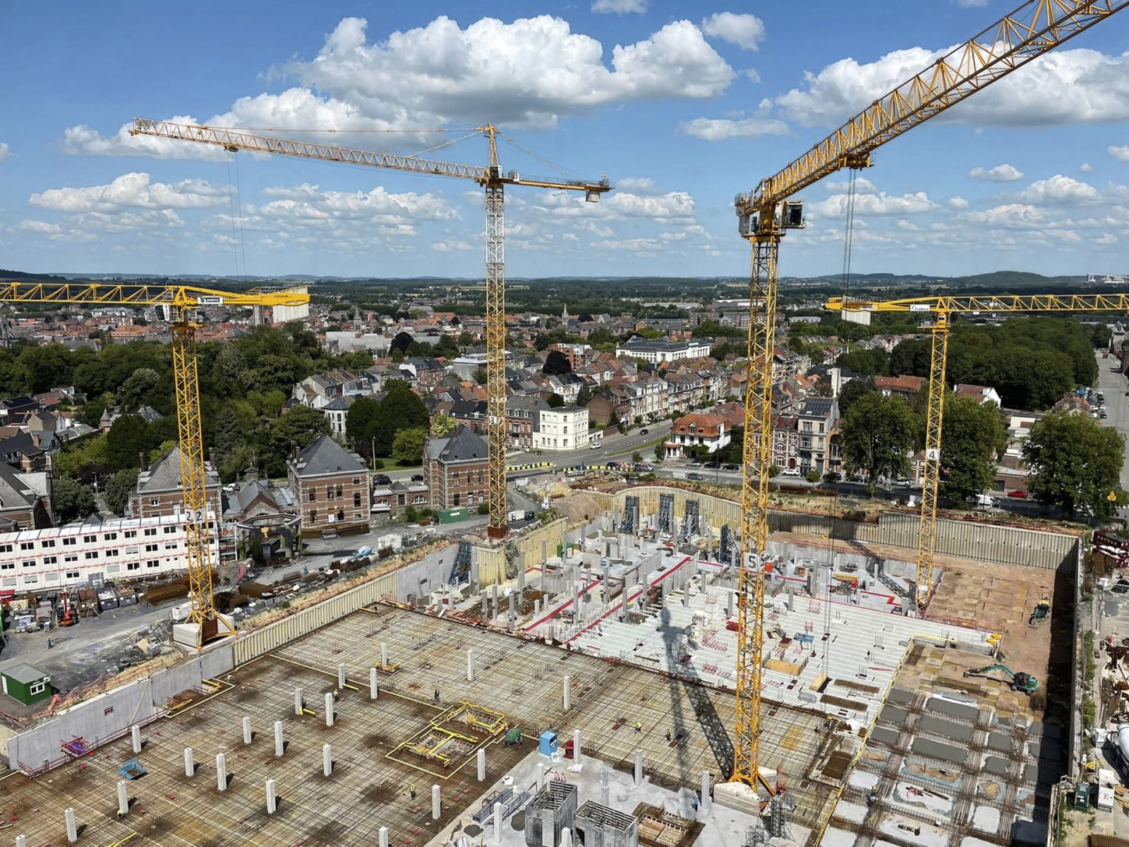 The project is under time pressure. Another challenge is the complex logistics on and next to the construction site on the busy Boulevard Lalaing, close to the center of the 70,000 inhabitants city. The responsible consortium of four construction companies (Galère, CIT Blaton, Dherte and Tradeco) relies on the MevaDec formwork system combined with the MEP and MT 60 shoring systems to construct the post-tensioned concrete slabs quickly and in the quality required. The work on site was also supported by Revit planning from MEVA Benelux.
