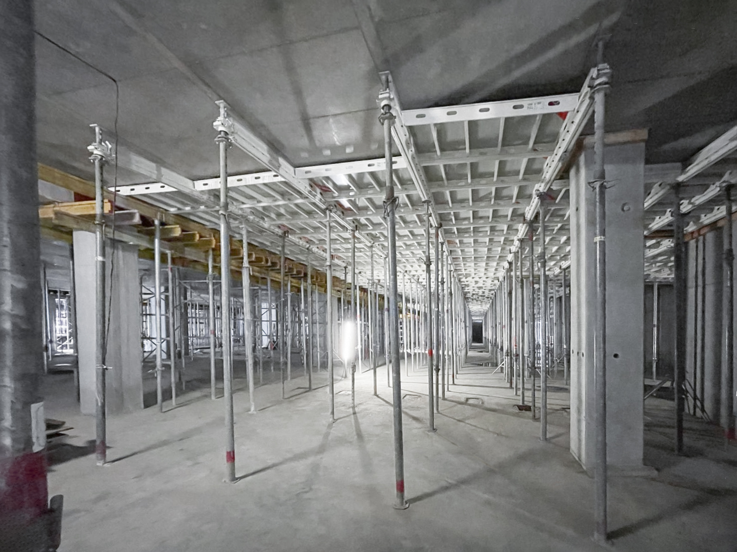 The first floor (22,000 m² area) was completed in early summer 2022, and since then the structure has rapidly gained height. The MEVA formwork center Benelux in Landen, Belgium, also supplied the MEP and MT 60 modular shoring systems. They can be optimally combined with each other and with MevaDec, providing safety and flexibility when working at height. Both shoring systems consist of only a few basic components and frame types. This allows easy handling, error-free assembly, transparent stock-keeping and lean logistics.
