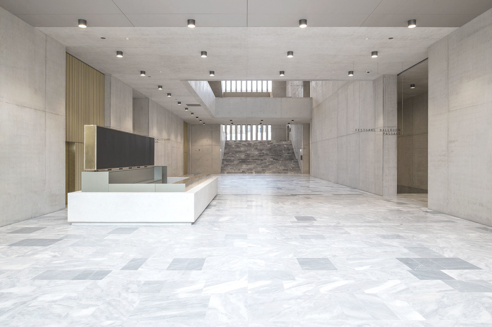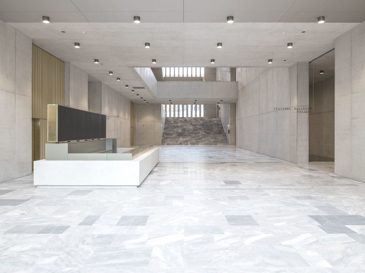 An important aspect of the planning and implementation of the entire building was the requirement that all corners be sharp-edged. In addition, the joint pattern was specified by the architect throughout the entire building. These requirements were a significant challenge in the large hall.Despite openings and flights of stairs in various locations, the joint pattern had to extend precisely and without offsets over the entire height – and even on the large concrete beams. The work therefore required exact planning and had to be performed with great care during construction.
