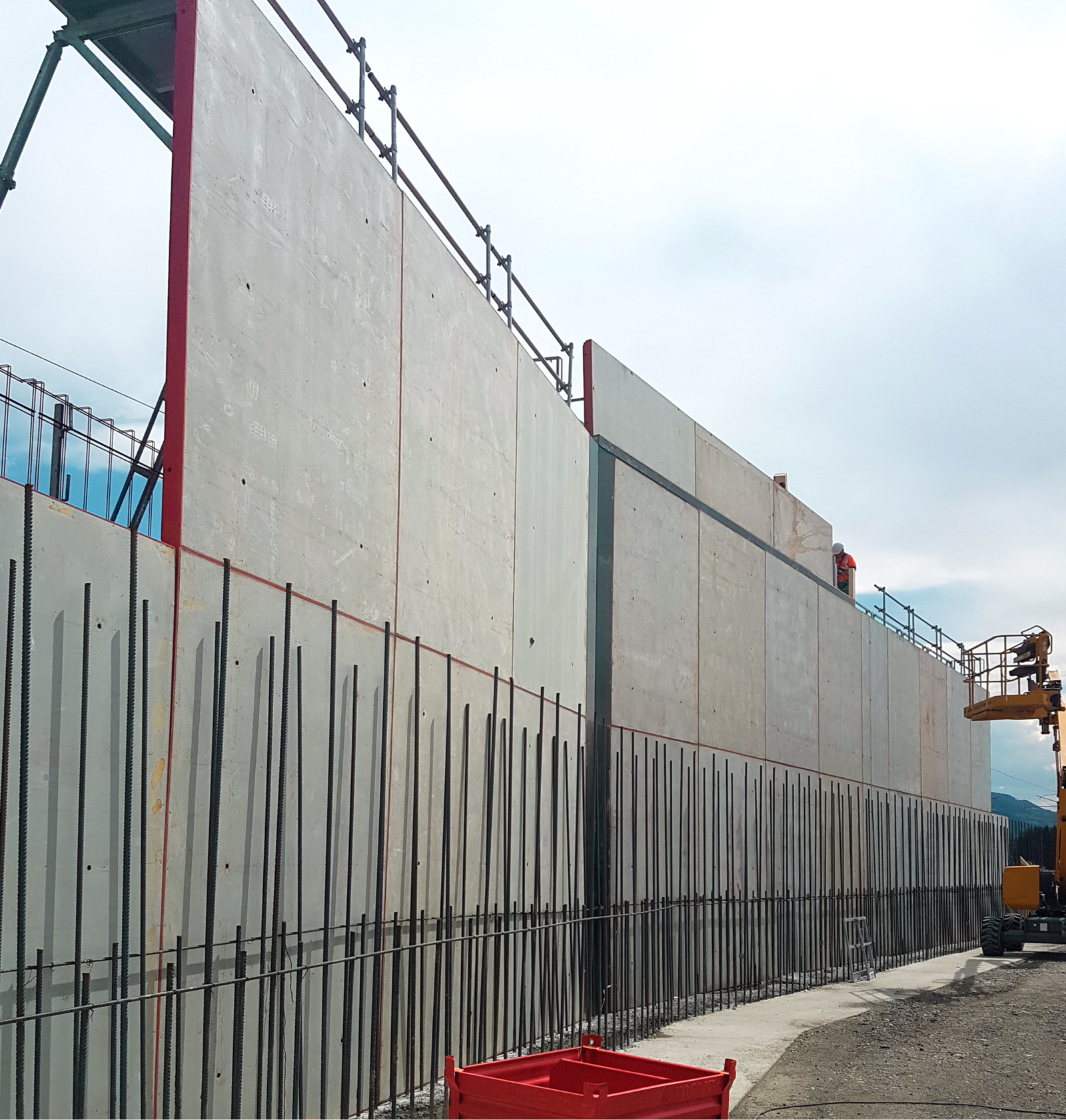 For the cantilevers – which were 79 centimetres long and needed to be poured at a height of 10 metres – access was an issue. To get around this, the SecuritBasic safety system was used in conjunction with the Mammut 350 panels. The working platforms enable safe and cost-effective work at height and can be flexibly adapted to suit the formwork structure. This way, the cantilevers could be poured without infringing upon the railway line below.