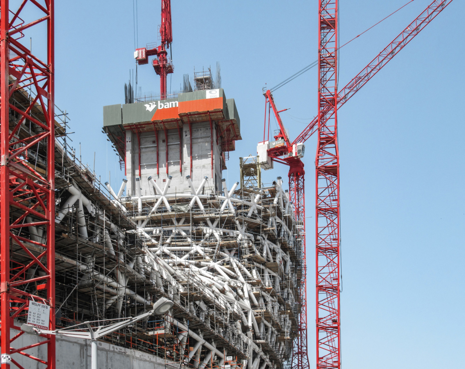 The labyrinthine basement of the Museum of the Future is smaller than the floors above and has no round walls or sloping ceilings.Using the 3.50m high panels of the Mammut 350 wall formwork system, it was possible to form the walls with extreme precision. The rate of placing was immaterial thanks to the fresh-concrete pressure capacity of 100kN/m².