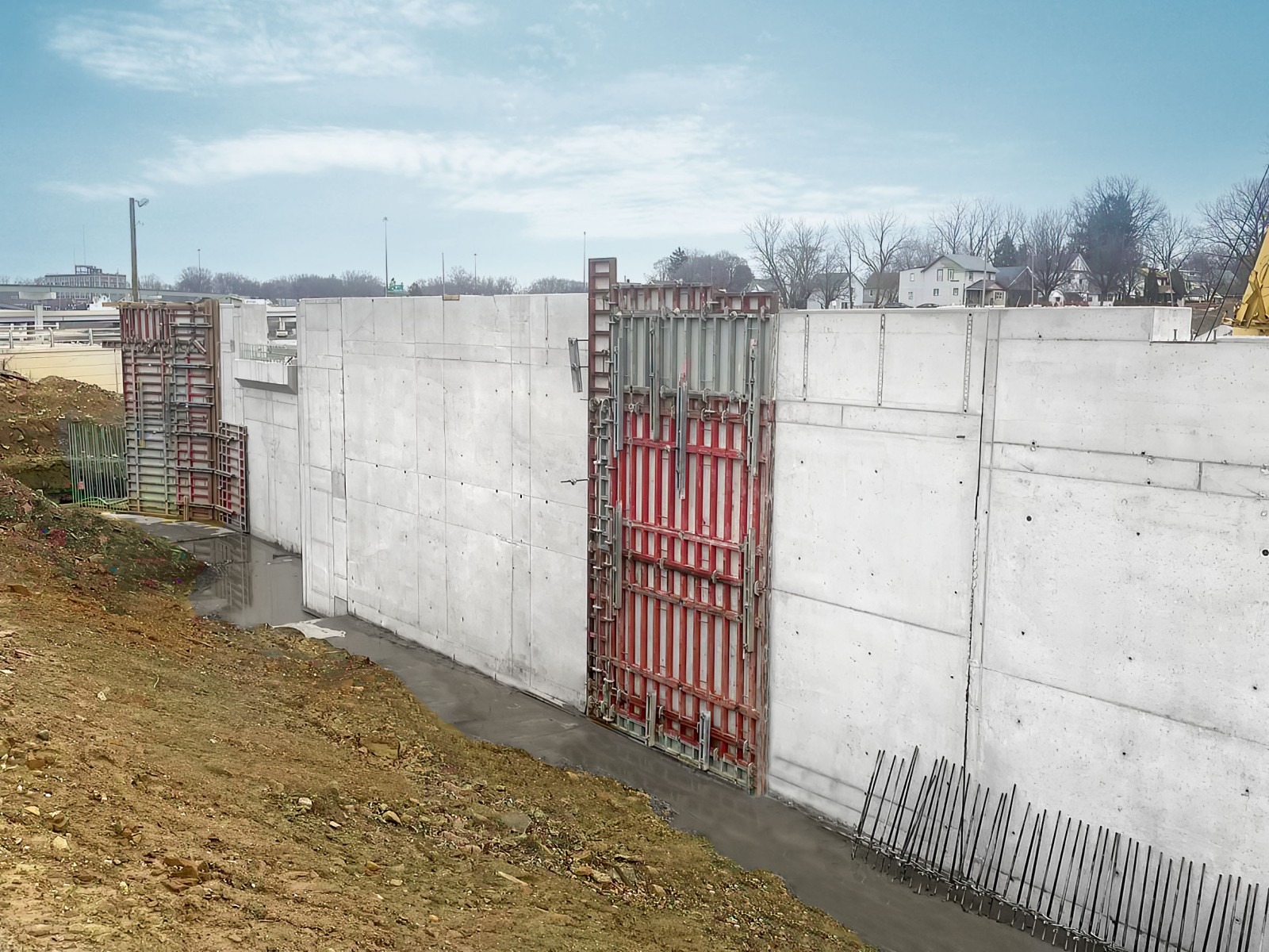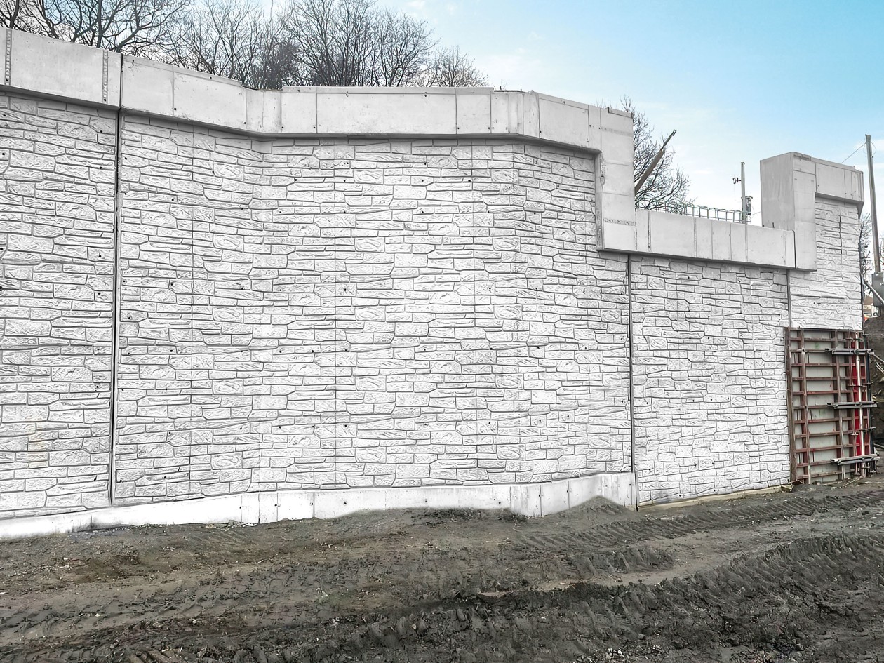The main scope of the reconstruction project involved building retaining walls with a continuous 34” x 33” coping beam over the top of a 26” wide wall. The wall formwork below the coping was covered with a stone formliner. In the 26 ft long pour, the coping was installed without a slope. However, each wall had to step up and down to adjust the different wall heights and footing elevations. The forms were designed with the upper portion, including the coping, which was unchanged as forms cycled throughout the project. Height adjustments were then made at the bottom of the forms.