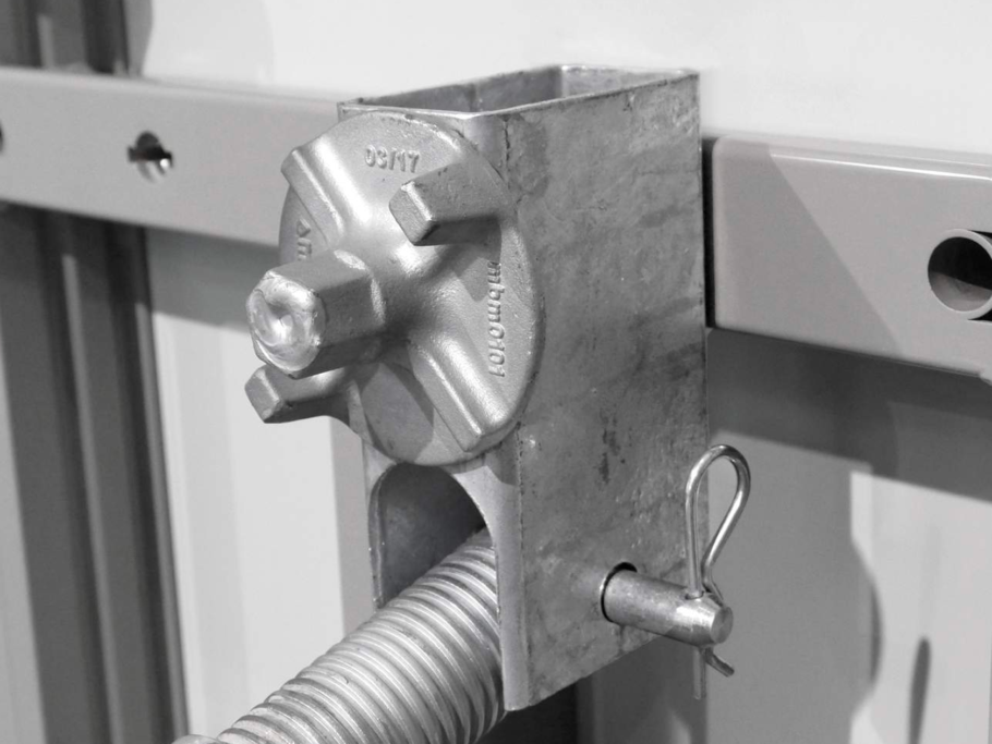 - Serrure de coffrage MEVA pour un assemblage robuste et rapide au marteau.
