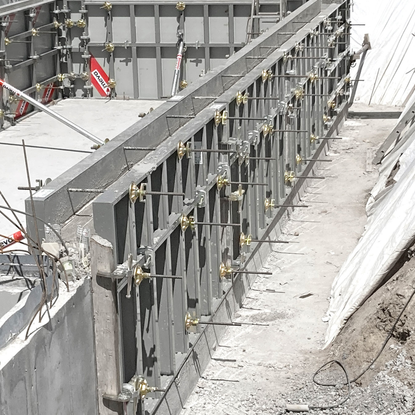 Les panneaux de 25 à 55 cm de large facilitent la réalisation des fondations et des murets, sans recourir à l’ancrage traditionnel. Le coffrage est posé à l’aide de feuillards perforés et fermé par des tendeurs.