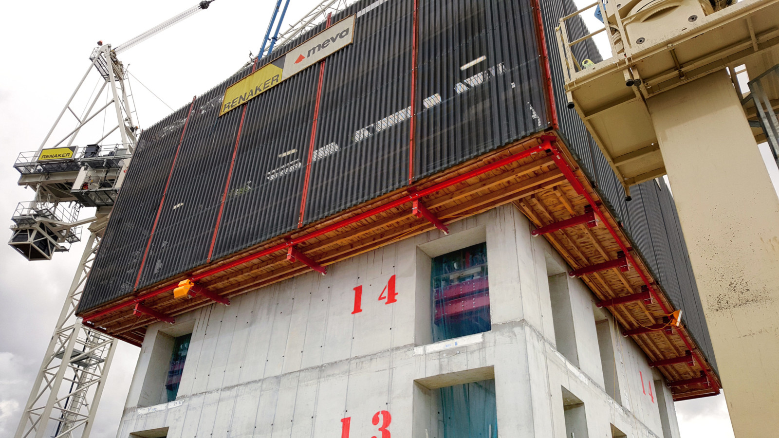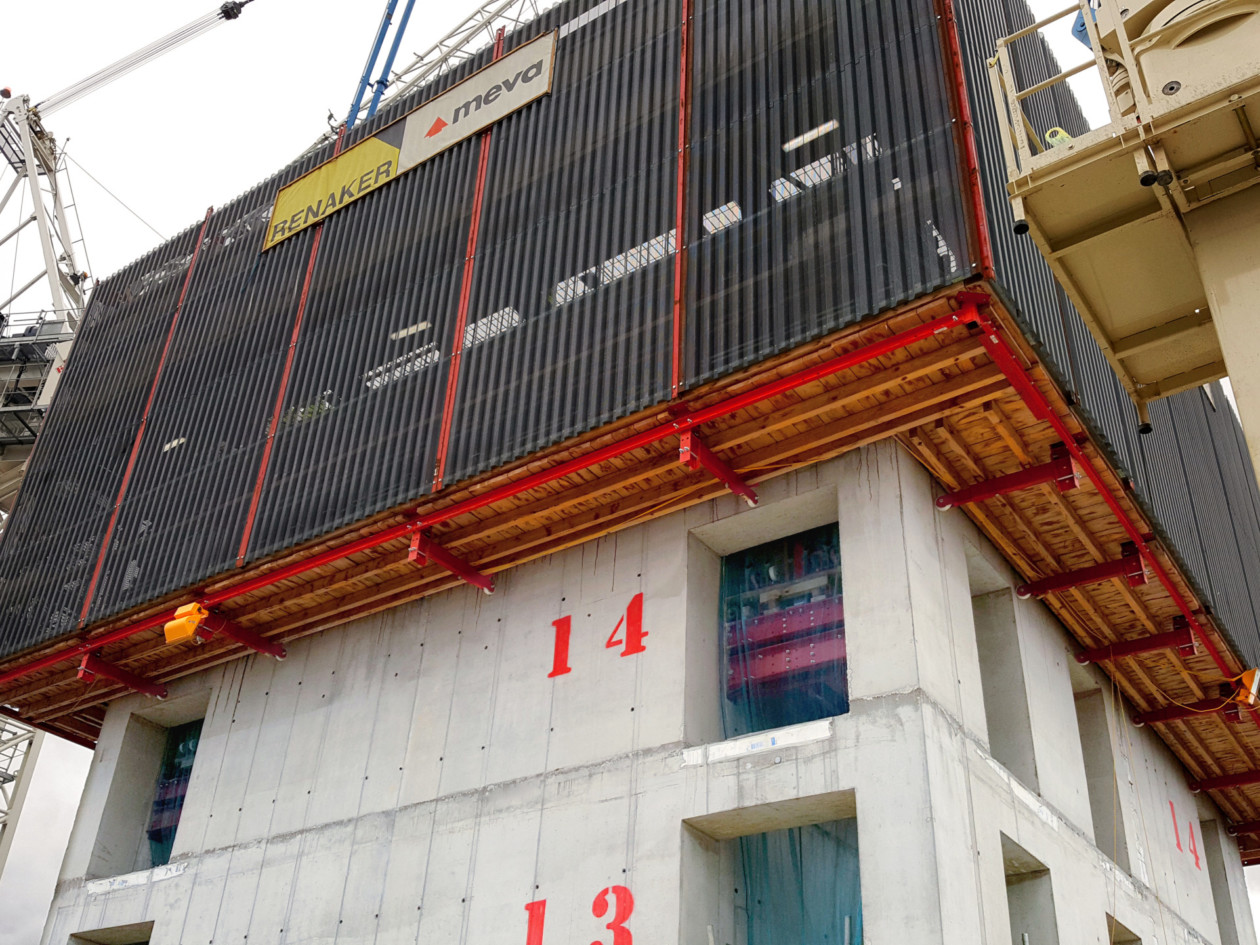 Après achèvement du premier bâtiment, le coffrage auto-grimpant a par conséquent dû être déplacé, par modules complets, ce qui a été plutôt facile à réaliser : les peaux du coffrage ont été nettoyées et contrôlées. Le système MAC a ensuite été mis en place sans attendre sur le noyau du bâtiment suivant.