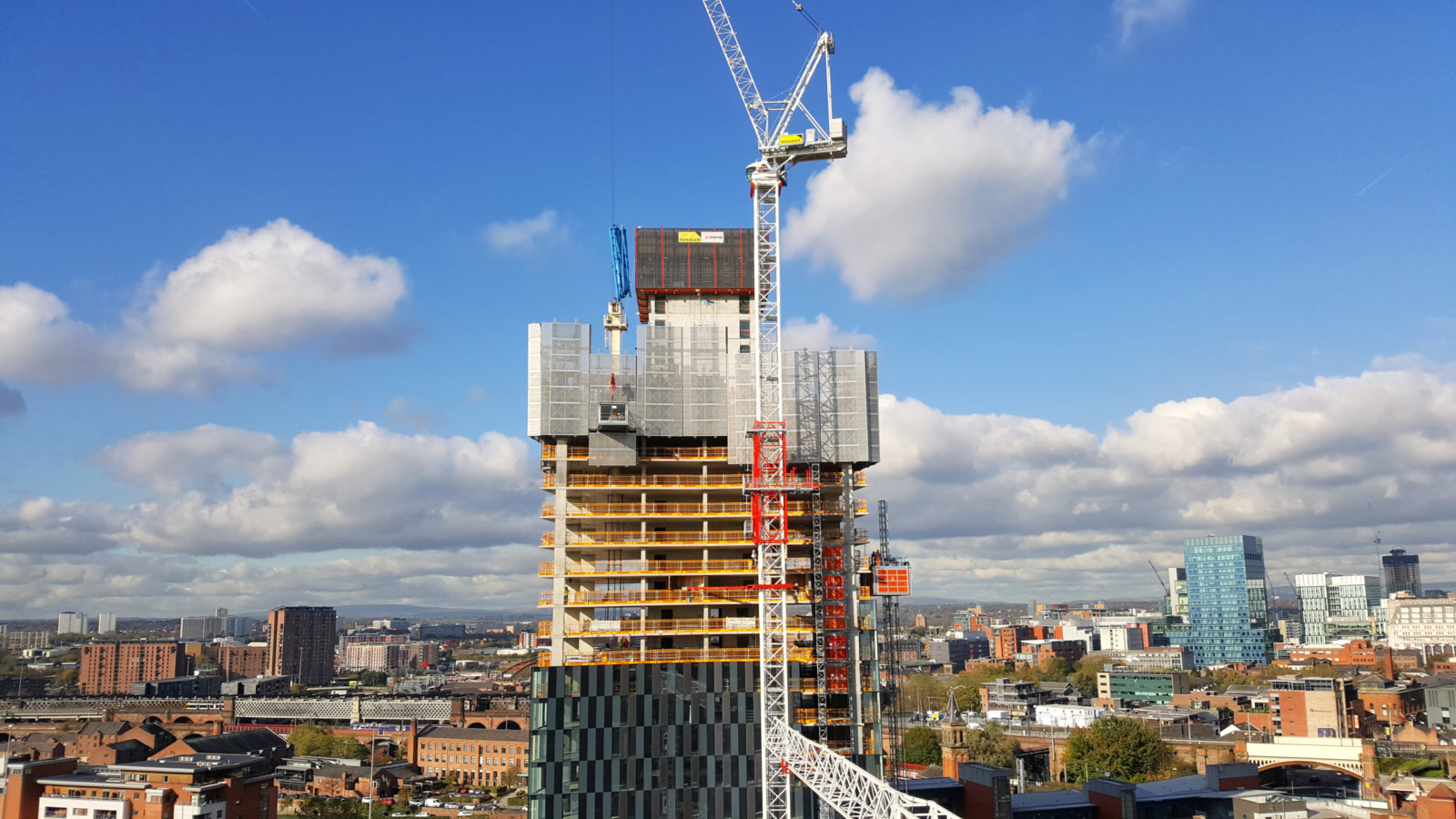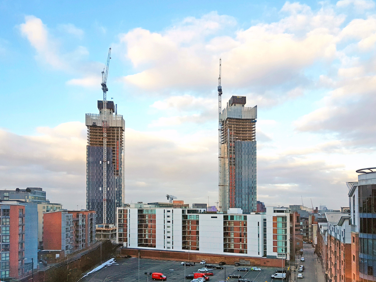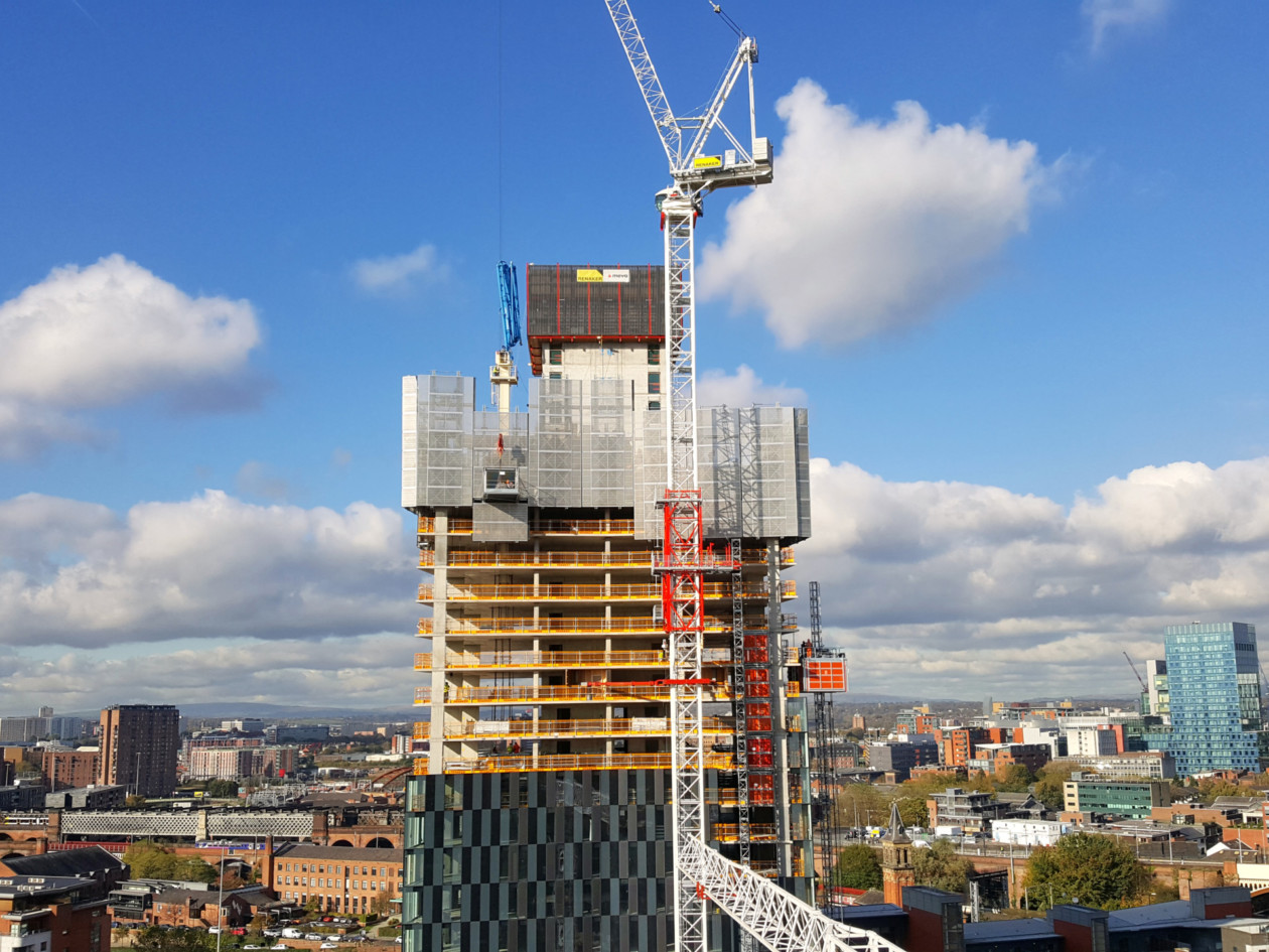Pour exécuter rapidement les 37 à 66 étages de ces tours à vocation résidentielle, la mise en œuvre d’un système MAC sur chaque tour semblerait logique. Il n’en a pourtant pas été ainsi, car même pour les objets de prestige les économies sont de rigueur. Voilà pourquoi les responsables du projet ont décidé de faire grandir les quatre immeubles dans le ciel de Manchester avec deux systèmes auto-grimpants.