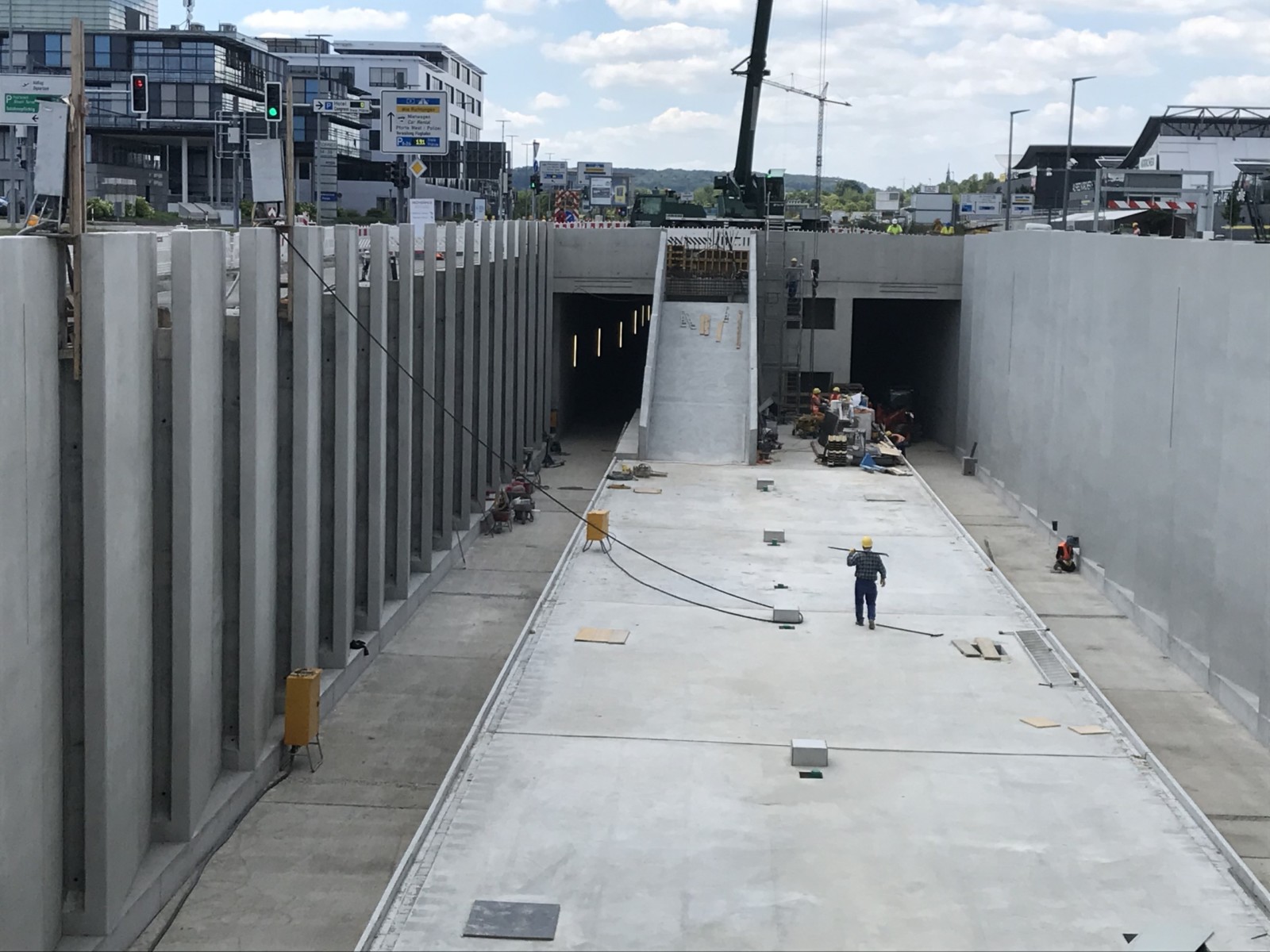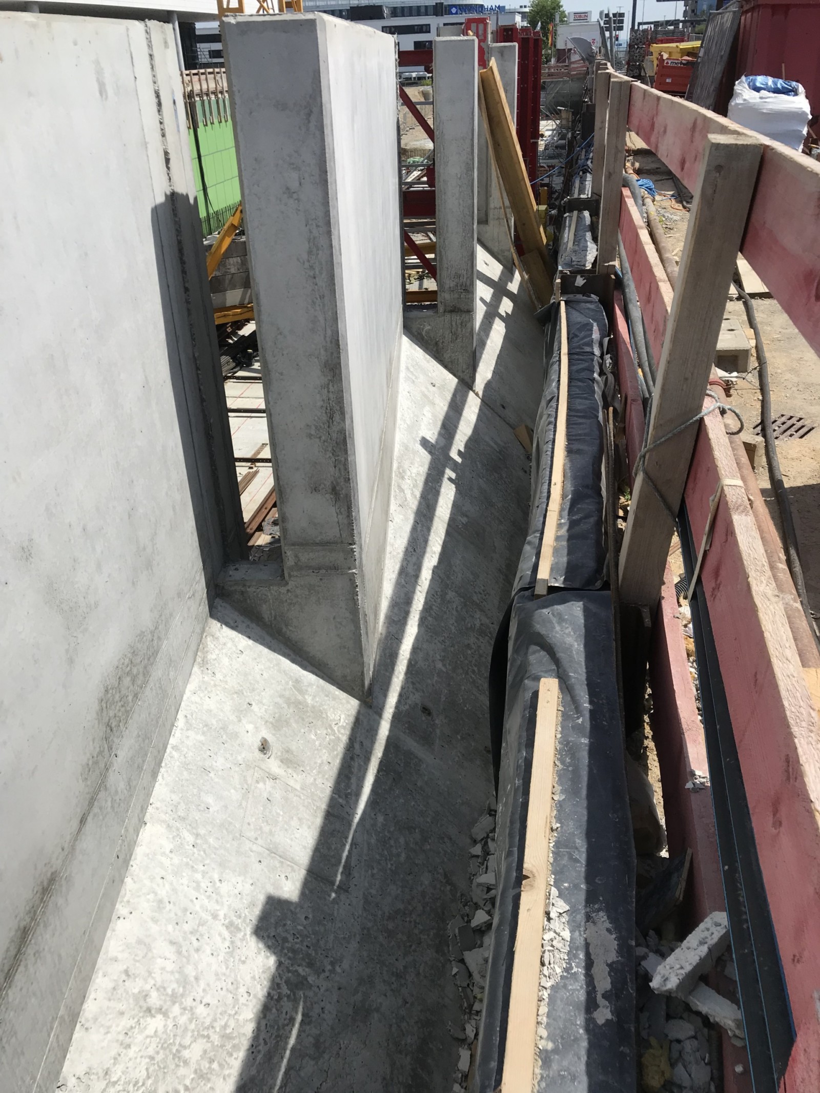 Sur le tronçon à ciel ouvert de la station, situé entre le « Kongresshotel » au nord et l’aéroport au sud, les « voiles en écailles » pointent vers le ciel jusqu’à 9,30 m. La hauteur de ces voiles est variable, ce qui a été pris en compte lors de l’étude, notamment en s’orientant sur la piste cyclable et piétonnière qui passe juste à côté. Les écailles ont toutes une largeur de 4 m et se chevauchent de manière à obtenir un effet d’écailles. Les voiles en écailles dépassent sur le haut et s’effilent en direction du ciel. Ce rétrécissement a été obtenu à l’aide d’un coffrage face arrière. Pour permettre un avancement rapide et efficient des travaux, il fallait aussi que les panneaux du coffrage spécial puissent être couplés entre eux.