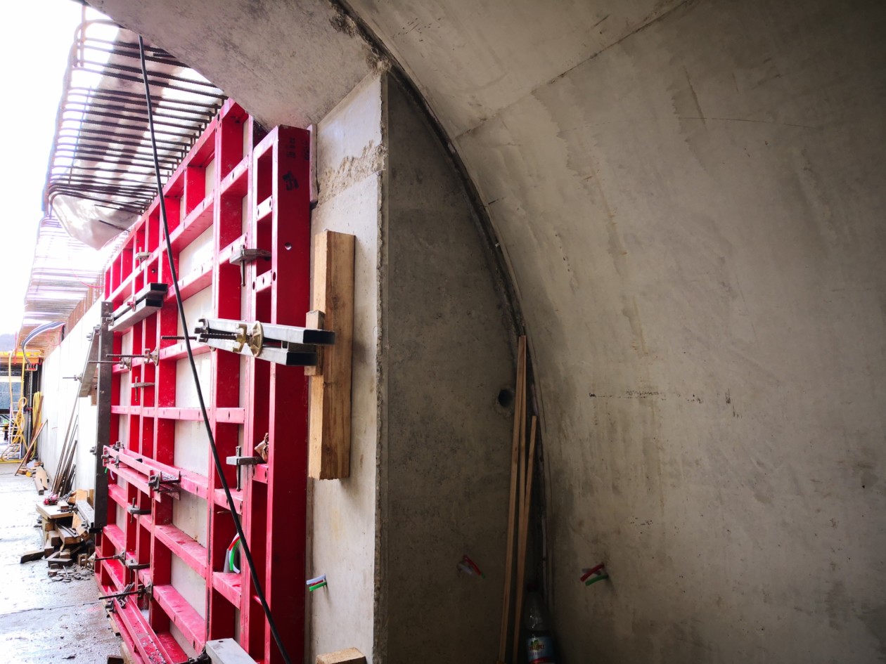 Les deux galeries de secours sont quasi similaires au niveau de la construction et se différencient principalement par leur longueur. Les coffrages ont donc pu être mis en œuvre dans les deux galeries.Les travaux ont commencé par la réalisation de la tête de tunnel, pour relier les galeries de secours au tunnel routier existant. La partie supérieure de ce raccordement a en partie été réalisée avec un coffrage spécial pour épouser la forme de la voûte du tunnel creusé.