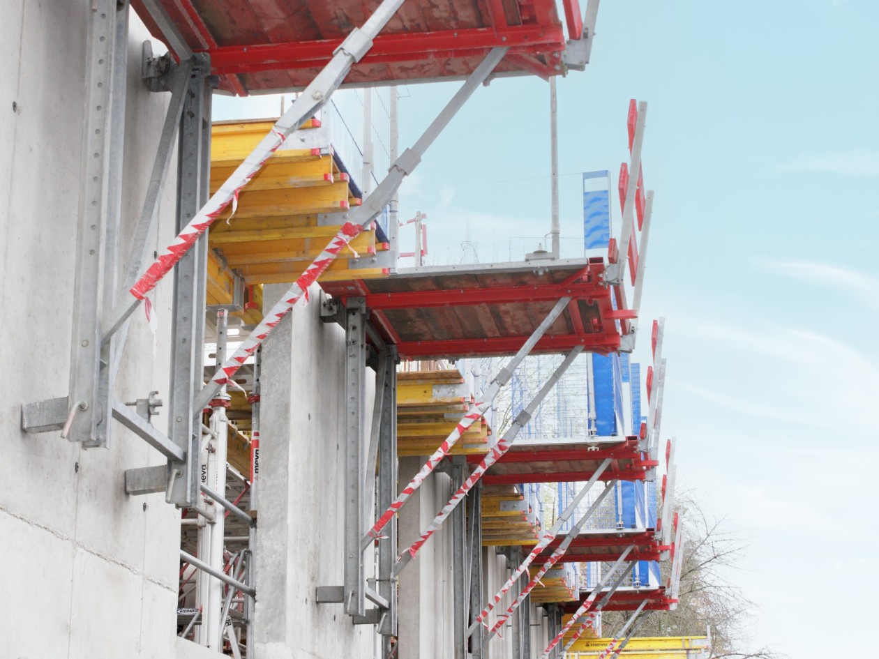 Sur le côté avant des étages de parkings, des murs de contreventement sont réalisés pour des questions de stabilité et de résistance. Entre les murs, il est prévu d’installer des surfaces vitrées. Pour accéder à la face extérieure du coffrage, un échafaudage traditionnel devait initialement être installé. La plate-forme de travail pliable KAB de MEVA s’est avérée plus avantageuse et plus efficace qu’un échafaudage traditionnel en matière de coûts et de main-d’œuvre. Les consoles assurent la reprise des charges permanentes et des charges d’exploitation. Les plates-formes KAB ont fait leurs preuves au niveau de l’étroite zone d’accès, entre la façade du bâtiment et la limite du terrain voisin. Elles sont également mises en œuvre sur le chantier pour d’autres travaux du même type.
