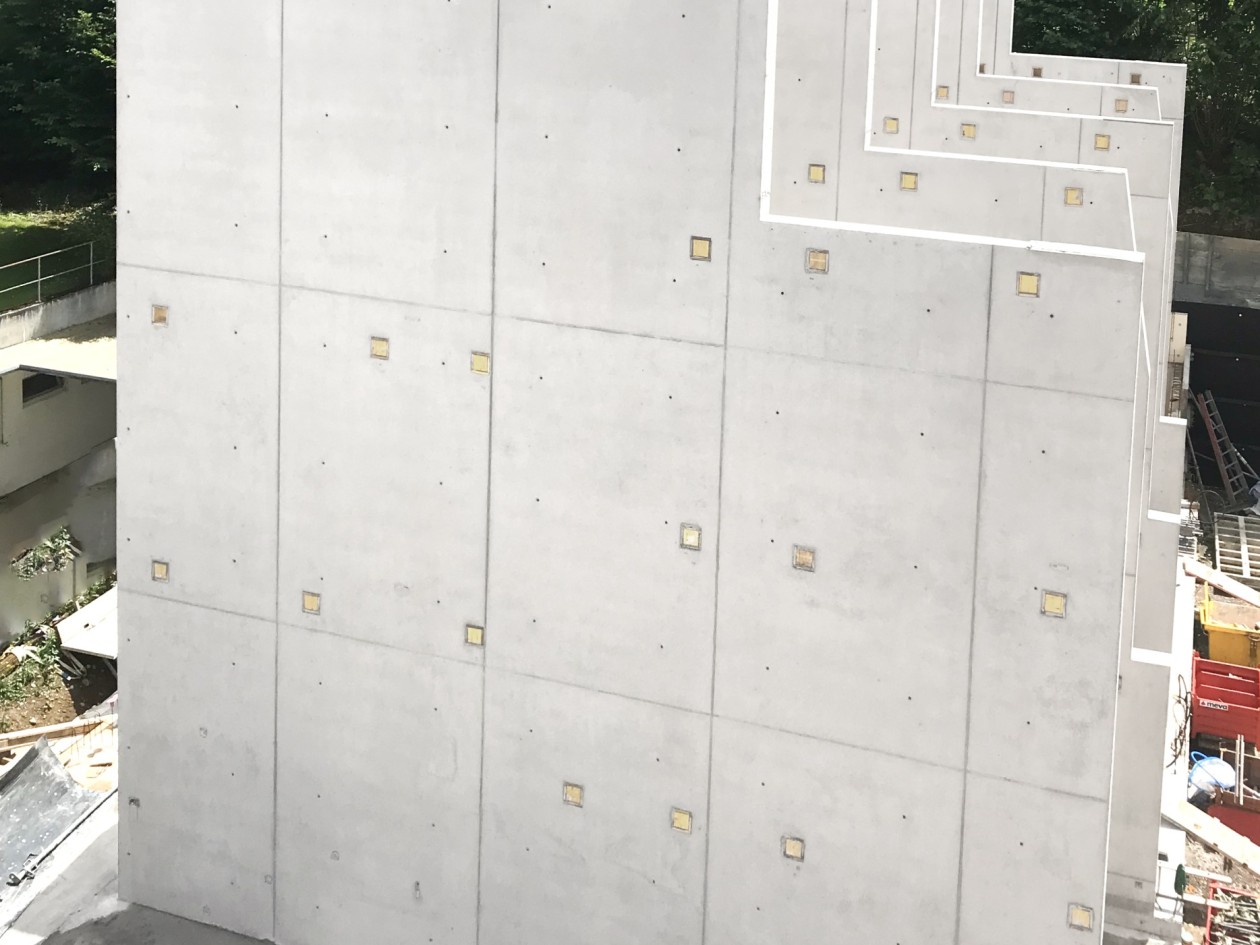 Lors du coulage des trois premiers voiles, des boîtes dynamométriques ont été utilisées par la Hächler AG pour surveiller la pression au niveau des tiges d’ancrage. Avec la méthode de coulage utilisée sur le chantier, la pression de bétonnage admise par le coffrage Mammut XT (100 kN/m²) n’a jamais été dépassée, ce qui a permis de se passer des boîtes dynamométriques par la suite.