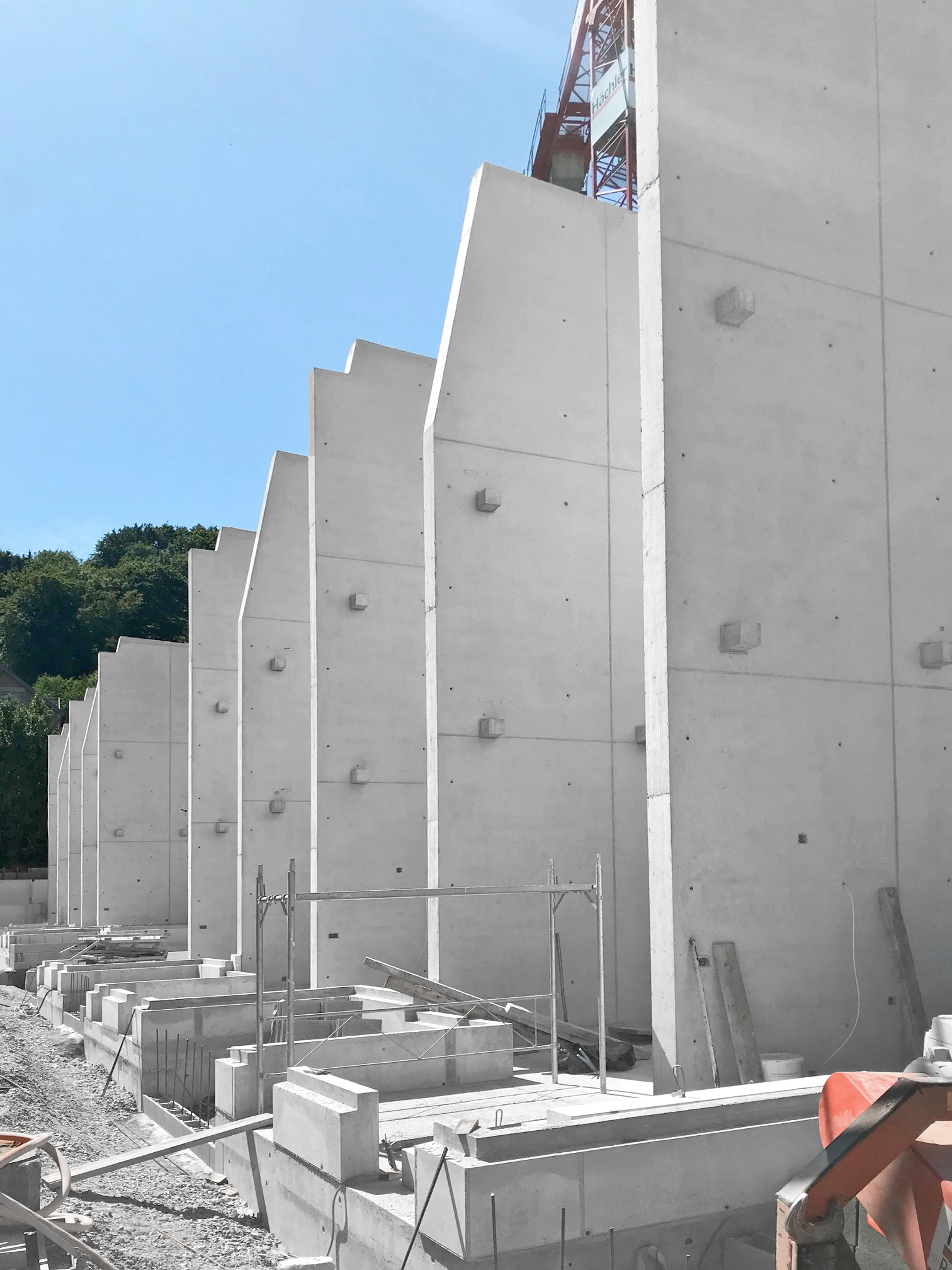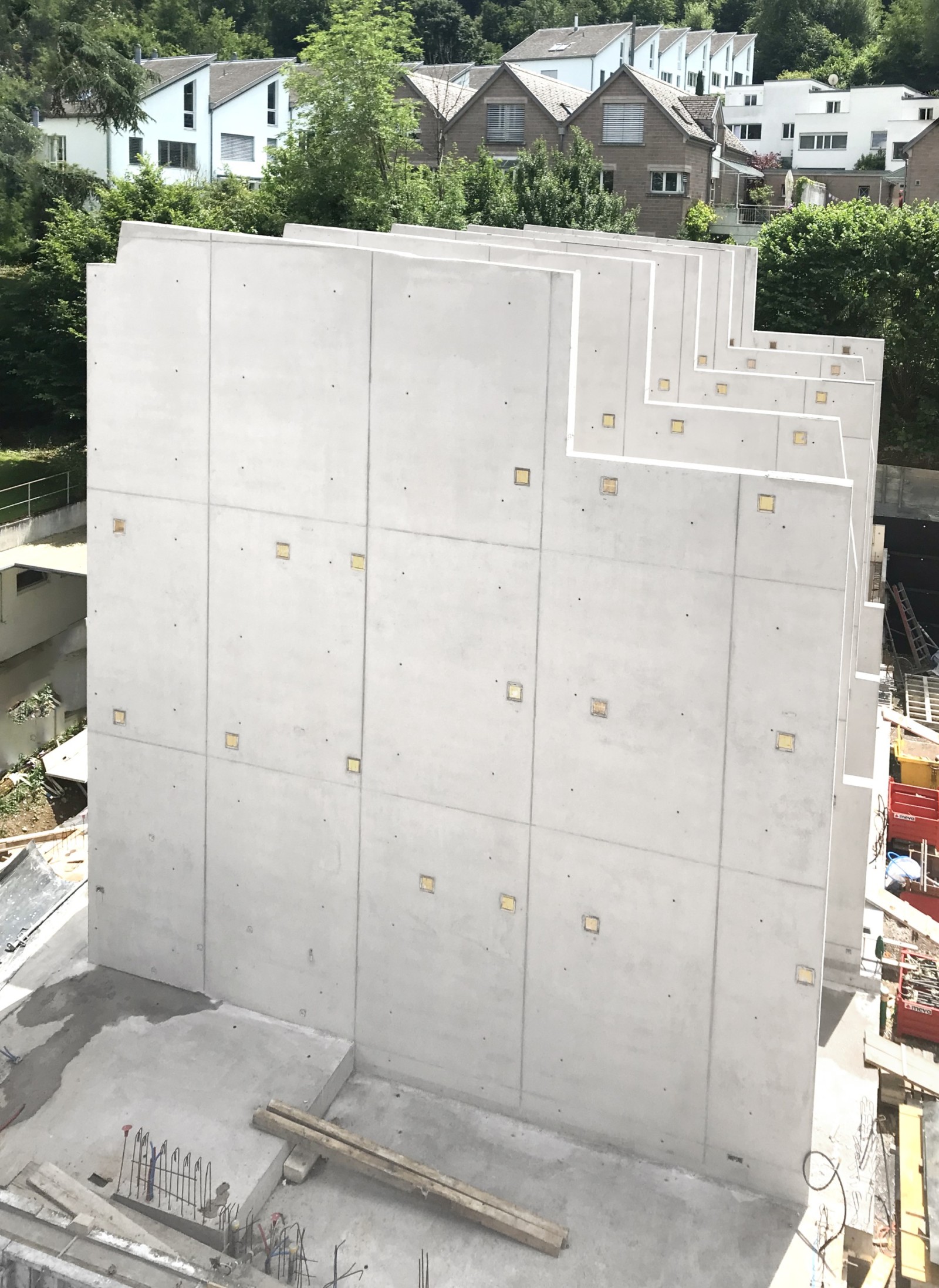 Un programme neuf de 12 maisons mitoyennes est en train de voir le jour dans la ville de Baden, en Suisse. L’entreprise de construction, la Hächler AG Hoch- und Tiefbau, a coulé d’un seul tenant les murs mitoyens entre les différentes maisons. La qualité des parements en béton est conforme aux prescriptions du maître d’ouvrage et répond aux attentes des architectes, ainsi qu’à celles de l’entreprise de construction.