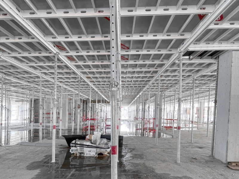 Pour réaliser les dalles situées jusqu’à 10 m de haut, c’est la MT 60 qui a été mise en œuvre à Tournai. Cette tour d’étaiement s’assemble sans outils, boulons ni broches, à l’horizontale ou à la verticale, et peut être déplacée en entier à l’aide d’une grue ou de roues de translation. Ses composants pèsent au maximum 15 kg. Des solutions intégrées (échelles sécurisées sur chaque segment, protection périphérique sur la plate-forme de travail, trappes d’accès et assemblages autobloquants) assurent le montage en sécurité pendant l’assemblage de la tour.