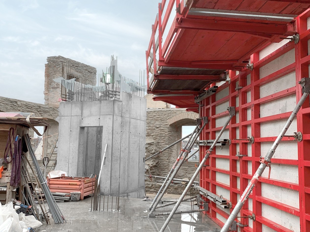 Le bâtiment multifonction se dresse sur trois étages, au-dessus des vestiges. Les prescriptions prévoyaient des parements de béton soignés avec une matérialisation régulière des joints. Pour les endroits où il fallait construire à quelques centimètres de l’ancienne structure, le chantier a fait appel à des éléments préfabriqués. Le coffrage de grande dimension Mammut 350 a été mis en œuvre dès que l’espace disponible le permettait.