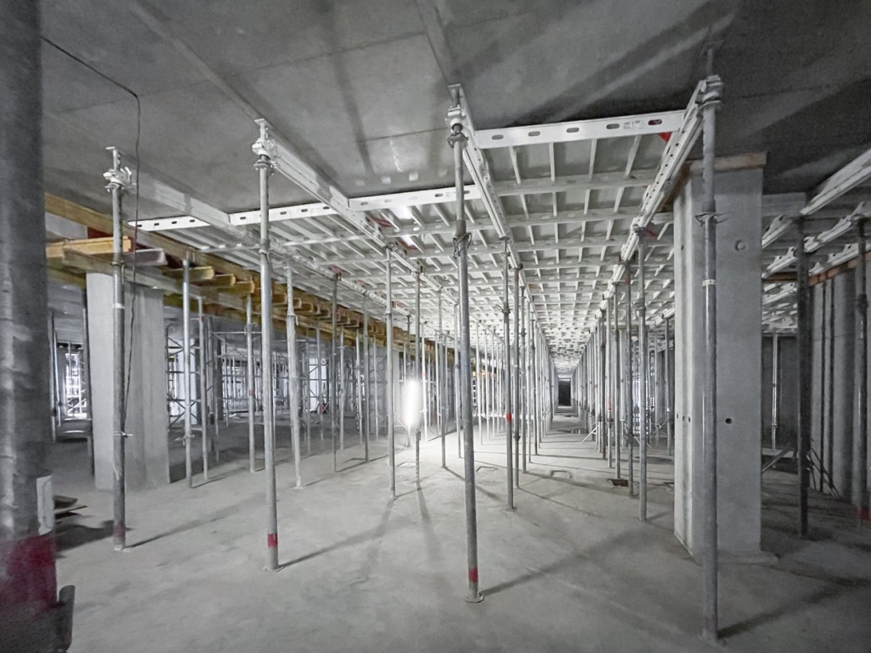 Le premier étage, d’une surface de 22 000 m², a été achevé au début de l’été 2022. Depuis, le bâtiment pousse à vue d’œil. Le Centre de coffrage MEVA Benelux de Landen, en Belgique, s’est également chargé de la livraison des systèmes d’étaiement MEP et MT 60, qui se combinent facilement entre eux ainsi qu’avec le coffrage MevaDec. Composés d’un petit nombre de pièces et de cadres, ces deux étaiements ont été pensés pour faciliter l’assemblage, éviter les mauvais montages, assurer une meilleure gestion des stocks et la fluidité logistique.