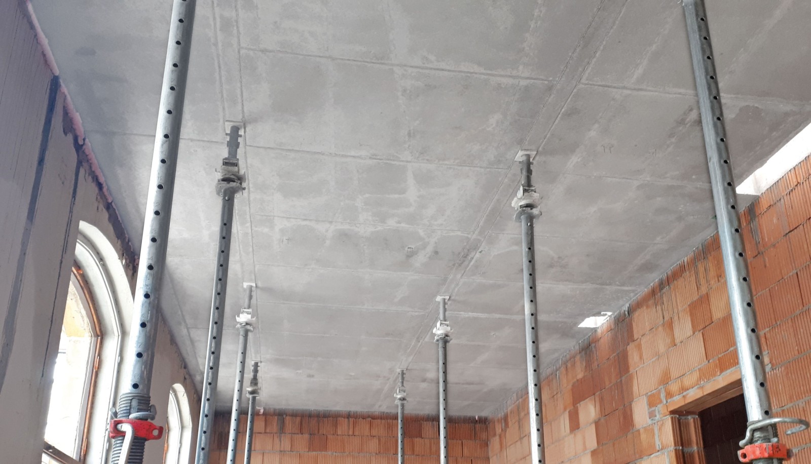 Pour l’entreprise GERSTL, en charge du gros œuvre, les travaux ont consisté à déconstruire par tronçon et à réhabiliter dans l’existant. Des murs ont été adaptés et nouvellement érigés, les planchers à solivage bois ont laissé la place aux planchers en béton armé. La charpente et la toiture ont également été refaites en grande partie. Comme les volumes étaient définis par l’existant, il fallait que les systèmes de coffrage mis en œuvre sur le chantier soient particulièrement faciles à manier et adaptables à toutes les géométries. Voilà pourquoi l’équipe de GERSTL a misé sur le coffrage de dalles MevaDec et a utilisé 400 m² de panneaux pour une surface de plancher totale de 2500 m².