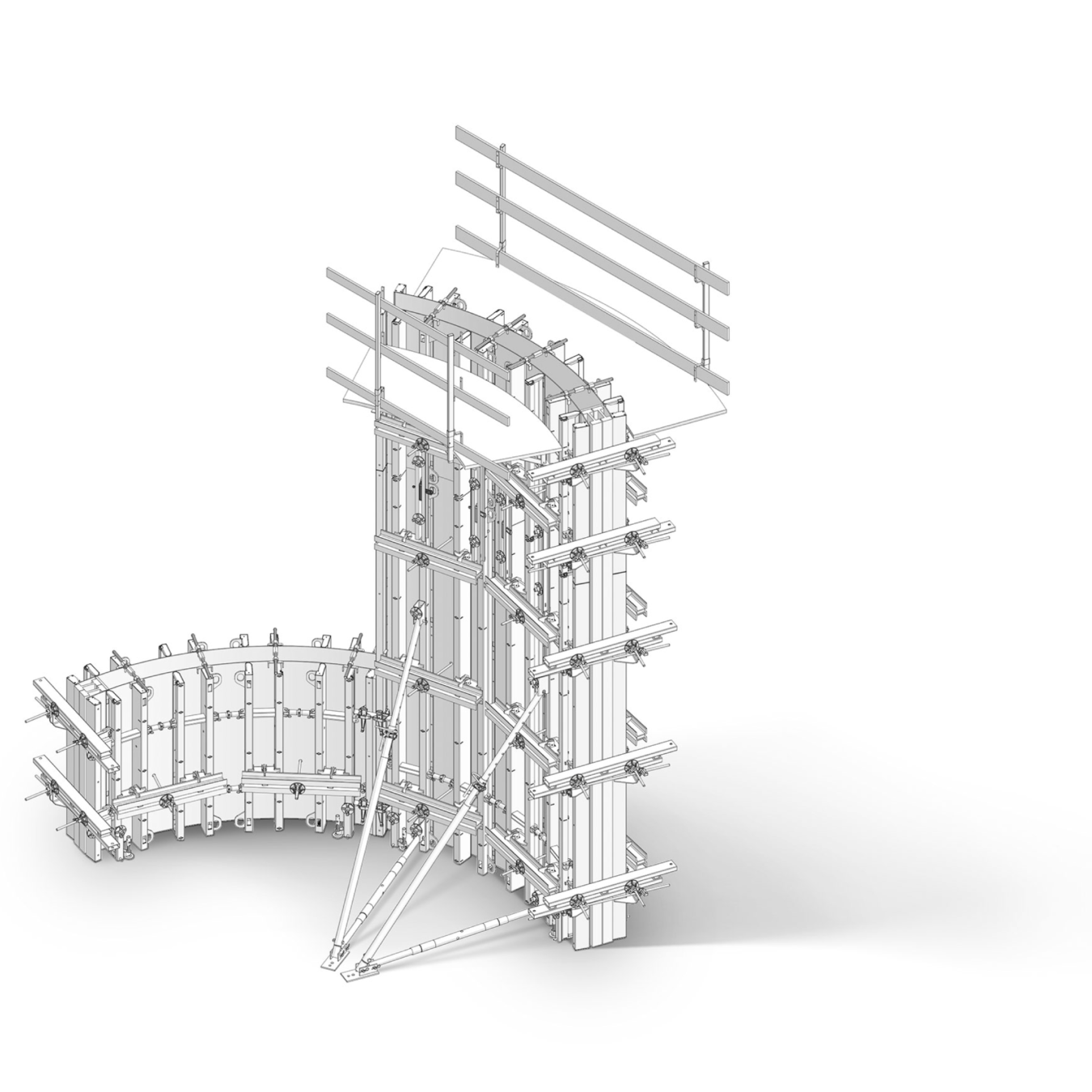 Het flexibele systeem voor alle ronde wanden bestaat uit kant-en-klare bekistingselementen die traploos kunnen worden gebruikt voor radiussen vanaf 250 cm.