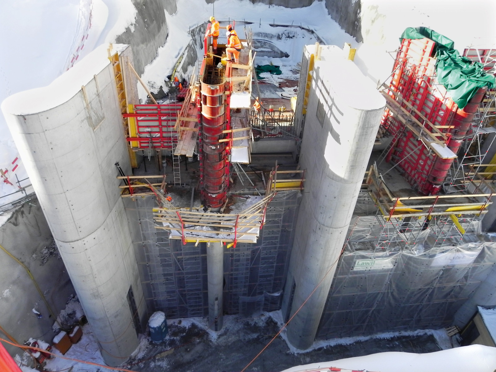 Switzerland’s largest and most powerful hydro power plant is being built under the project name «Linthal 2015». An underground pumped-storage hydro power plant will pump water out of Lake Limmern back to Lake Mutt which is located 600 m higher up. From, here it will descend again, producing electrical power. FormworkPress reported on progress of the underground works in the caverns. These are currently undergoing finishing works. Concrete works on the outlet and inlet structures on Lake Mutt are proceeding on schedule. The photographs show the site at level 2. During level 1 works, single-sided walls up to 11.25 m and double-sided walls up to 12.75 m were poured using the support frame STB 450 and its 1.50 m extensions plus the wall formwork Mammut 350. The formwork had to master exceptional concrete pressures during the pours.