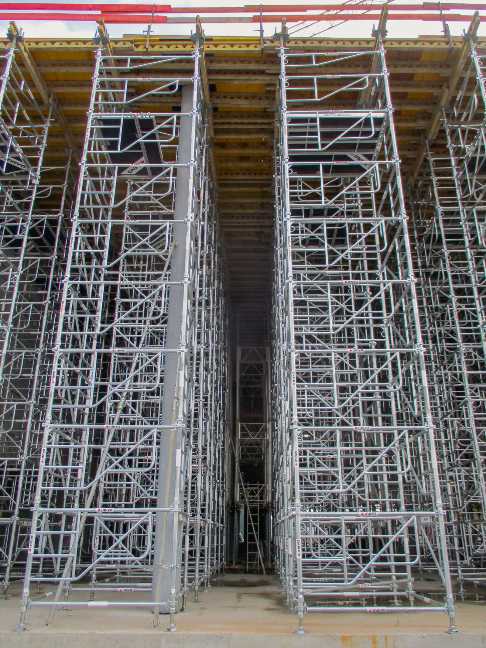 During the new construction of the West Entrance, the MT 60 shoring system supported 630 m² of in-situ concrete ceilings with thicknesses from 25 to 50 cm at heights up to 9.30 m inside the building. The shoring tower was assembled lying on the floor and erected using a crane. It is equipped with planking to form a work platform for slab framework removal. The cantilevered ceilings at heights up to 11 m were supported externally using the MEP shoring system. The quick and simple assembly thrilled both foremen and site manager.